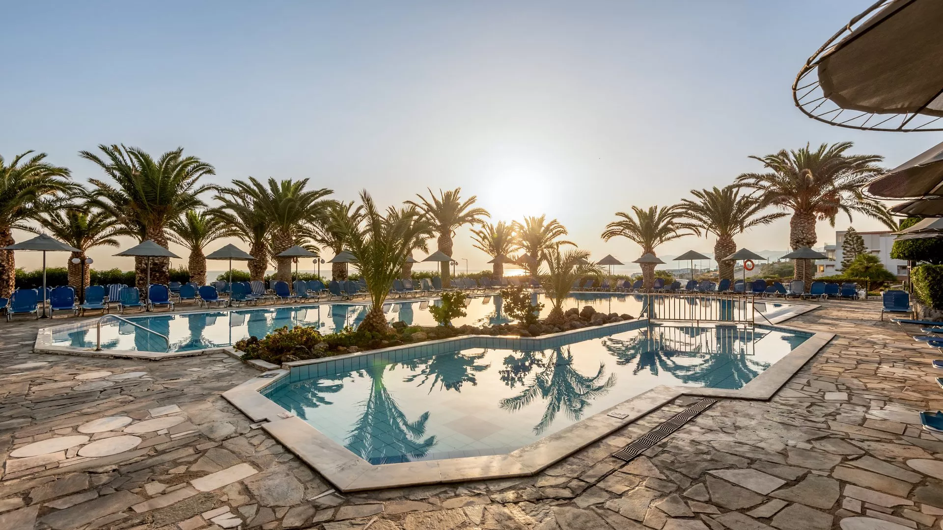 Skėčiai nuo saulės prie baseino