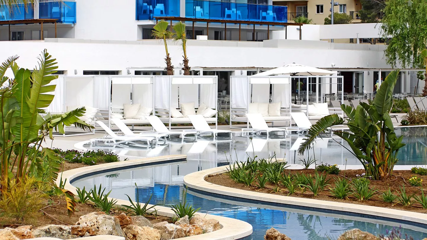 Skėčiai nuo saulės prie baseino
