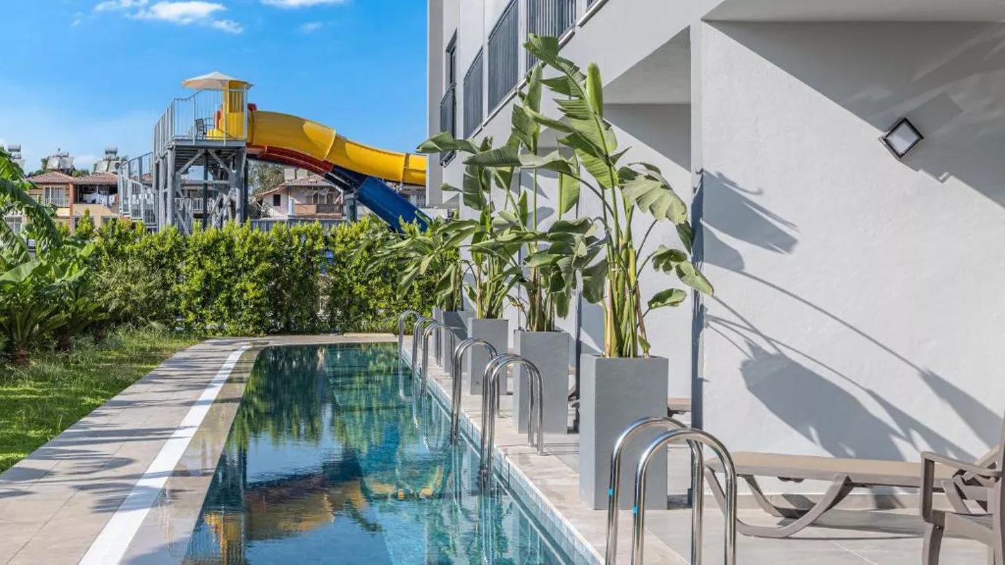 Skėčiai nuo saulės prie baseino
